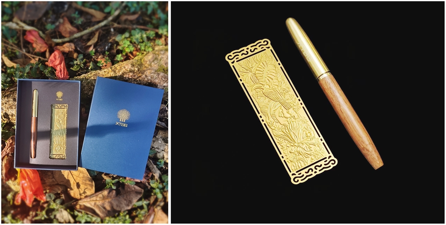 专为书写爱好者打造的钢笔礼盒延续了花梨木的温润质感,笔身镌刻“XTBG”标识,搭配黄铜镀金浮雕书签,以精湛工艺呈现雨林中的珍禽异兽与奇花异草。
