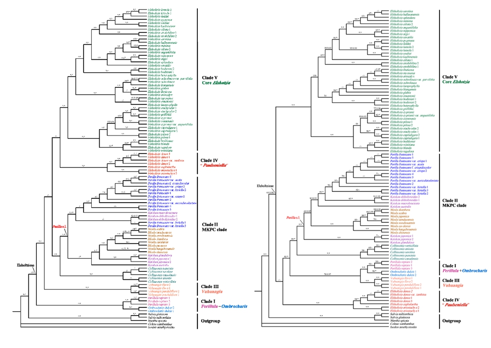 该研究是继研究团队首次明确香薷族界限(Chen et al. 2016, Taxon)和其系统位置(Li et al., 2016, Scientific Reports)后,在该族系统分类学研究上取得的又一重要进展,不仅厘清了族内各属的界限,还编制了反映最新分类系统的分属检索表,并提供了密花香薷属和紫苏属的全球物种名录。相关成果以“Two in, one out: a comprehensive phylogeny of the tribe Elsholtzieae (Nepetoideae, Lamiaceae) sheds new light on its generic delimitation”为题发表在国际植物分类协会会刊Taxon上。版纳植物园李波研究员为论文第一作者,中国科学院昆明植物研究所向春雷研究员为通讯作者。研究工作得到了科技部科技基础资源调查专项、国家自然科学基金及中国科学院国际合作伙伴计划等项目的资助。