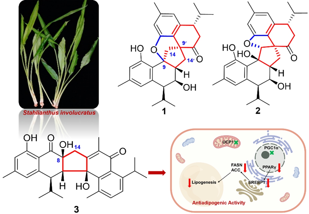 为明确姜三七抗脂肪生成的活性成分,研究鉴定出杜松烷类倍半萜为主要药效成分,并从中发现3个结构新颖的杜松烷二聚倍半萜—Distahlianins A-C。生源合成分析表明,这些二聚体可能由已知单体通过迈克尔加成、氧化、甲基迁移以及脱水或水合等酶促反应以及光催化生成。进一步机制研究表明,其中活性最强的Distahlianin C(EC50为5.27±0.75 μM)主要通过抑制PPARγ-SREBP-1信号轴及脂肪合成酶(FASN和ACC)发挥抗脂肪生成作用,而非通过脂肪酸β-氧化途径。该研究揭示了一类新型潜在降脂天然产物。相关结果以“Distahlianins A−C:architecturallydiversecadinane-typesesquiterpenoiddimers from Stahlianthus involucratus”为题发表于天然药物化学领域权威期刊Organic Letters,版纳植物园植物矿质营养研究组纪开龙副研究员为第一作者及通讯作者、梁岗研究员和上海药物研究所范耀月研究员为共同通讯作者。版纳植物园孙朋博士、鲁建美博士,云南大学联合培养硕士研究生郑曦宇参与该研究。文章一经发表即受到领域内权威杂志Natural Product Reports关注,其中Distahlianin A被列为热点分子(Natural Product Reports,2025,42,1646-1650),这也是团队第二个被该杂志重点关注的天然活性分子(首个以“Skeletonrearranged andoxygenatedent-rosanediterpenoids withantiadipogenicactivity fromEuphorbia milii”为题2024年发表于Chinese Journal of Chemistry的Euphomillanol A)。
