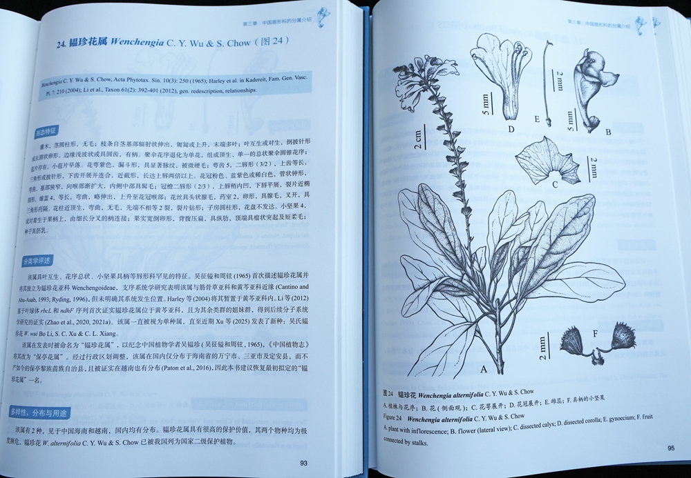 与《中国植物志》及其英文修订版Flora of China中唇形科记载的90余属800余种相比,该书将中国唇形科更新为100属1000余种,其中,23个属被归并为异名,另有26个属为新增,其中13个属自马鞭草科移入,13个为国内新记录、新建立或新恢复的属。截至目前,中国唇形科植物的多样性已涵盖全球12个亚科22个族中的11个亚科19个族。在分属介绍部分,该书采用中、英双语及传统手绘墨线图的形式,详细描述了各属的形态特征、地理分布、物种多样性及系统学研究现状。
