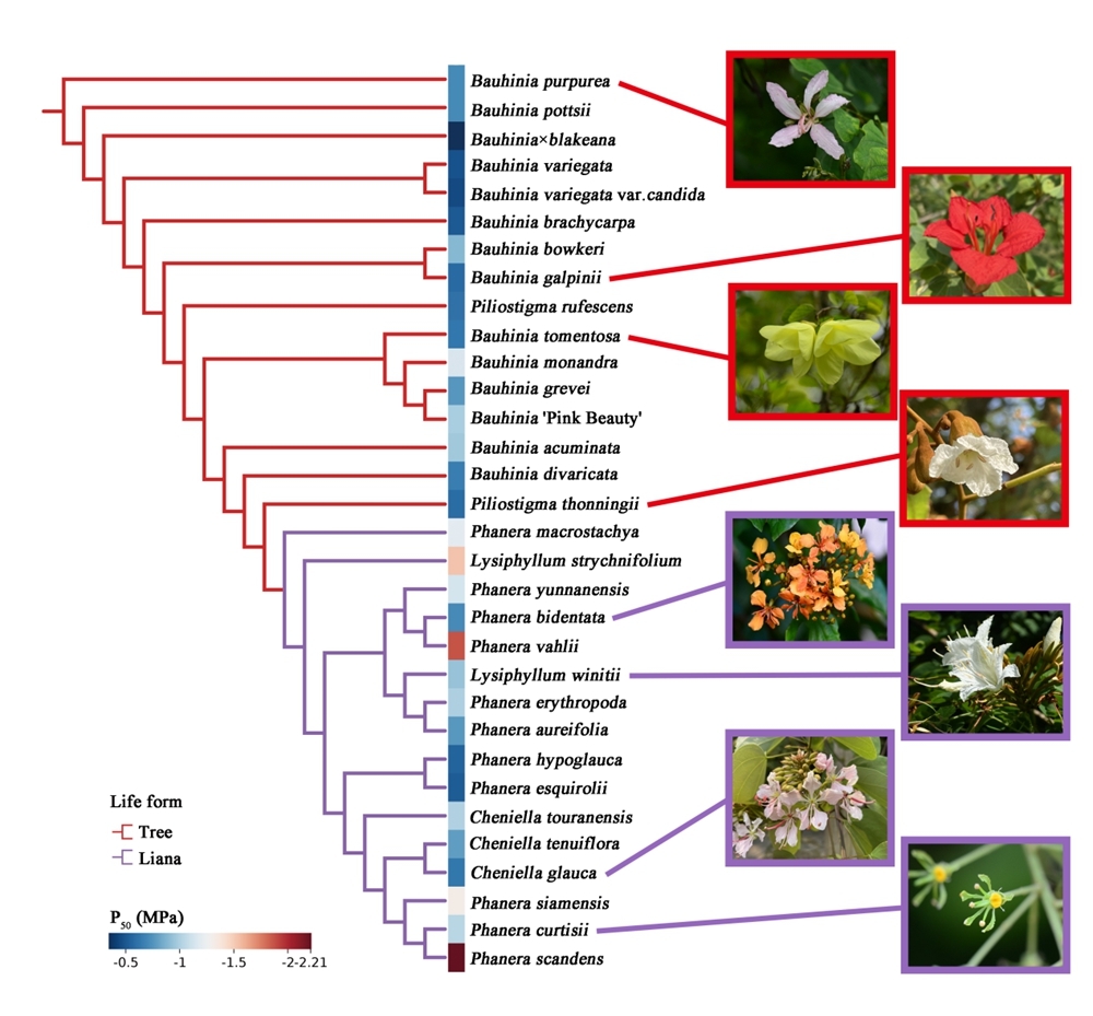 相关研究成果以“Divergent floral hydraulic strategies in Bauhinia s.l.: lianas adopt drought tolerance while trees prioritize drought avoidance”为题发表在国际植物学期刊New Phytologist上。版纳植物园植物生理生态研究组博士研究生柯妍为该论文的第一作者,张教林研究员、张云冰副研究员和美国纽约大学的Adam B. Roddy副教授为通讯作者。章永江研究员为该研究提供了重要建议。该研究得到了国家自然科学基金项目、云南省基础研究计划项目和版纳植物园“十四五”等项目的资助。