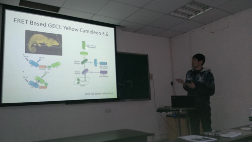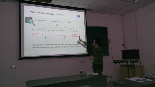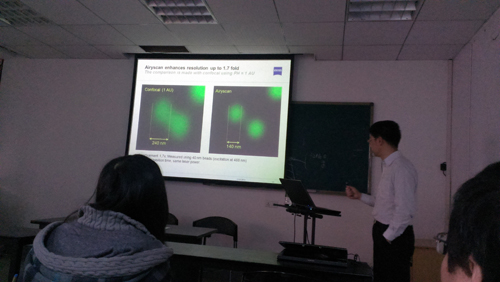3月12日上午,培训班在生物医学分析测试中心开始进行授课。首先,美国加州大学圣克鲁兹分校访问学者樊少鹏博士做了题为“Two photon imaging of brain: static and dynamic view”的报告,从一个神经科学研究人员的视角,阐述了双光子显微镜的工作原理、制样方法以及在神经科学领域中的重要用途。之后,蔡司应用工程师陆赟做了“多通道荧光及光谱拆分”报告,为大家讲解了激光共聚焦显微镜在多通道荧光拍摄中荧光串色的各种原因和类别(发射光串色和激发光串色),并给出了相应的解决方案,比如使用不同的扫描模式、进行光谱拆分和合适的制样方法等。