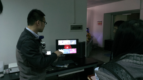 3月12日下午,学员们分成小组,分别开始在蔡司工程师的指导下进行上机操作和现场交流学习。在第一节课中,小组成员首先学习了七种主要的显微镜观察方式,包括:明场观察、暗场观察、相差观察、DIC观察(微分干涉)、霍夫曼观察、偏光观察和荧光观察,并进行了科勒照明的调节。在第二节课中,张彦工程师首先讲解了共聚焦显微镜的荧光共定位分析方法、图像分析方法和三维可视化方法,随后指导学员们进行上机演练。对于如何分析一张图像,张彦进行了详细的讲解,其步骤包括:通道分类、区域划分、阈值分割、分割物体、范围筛选、手动修改和参数选择等。