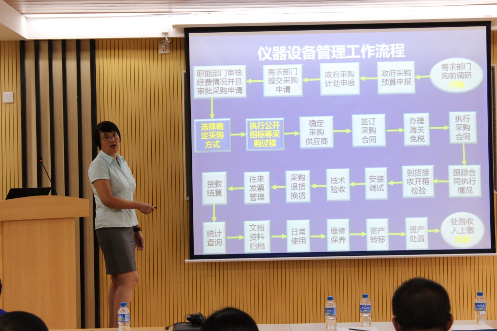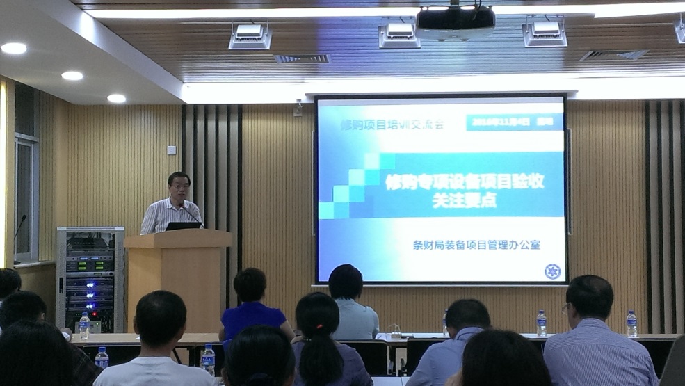 中科院条财局申孟芝首先做“关于修购专项设备验收关注要点”报告。详细介绍了验收流程中的各个要点,包括:修购专项设备项目的相关文件、修购工作组设立的重要性和职责、委托组织验收方案、验收总体组织方案、验收依据、验收标准、总体验收程序、验收程序网上运行方法、研究所验收准备工作内容、项目管理报告内容、项目工作报告内容、受托区域中心组织验收程序、现场验收会程序、验收评估表的内容、现场验收整改备忘的要求、验收通过后研究所报送的验收材料、受托区域中心报送的验收材料等。最后申孟芝对全院现场验收发现的共性问题进行总结和分析。