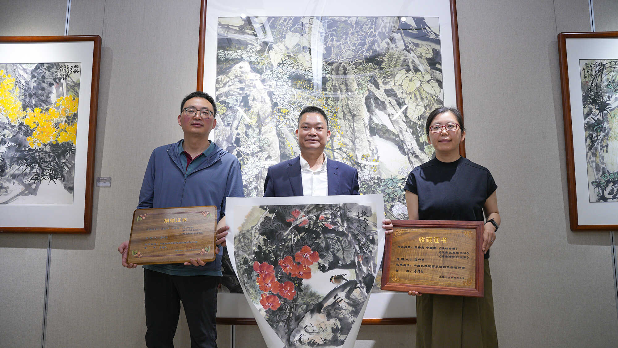捐赠仪式将活动推向高潮。王晋元先生夫人蔡仲明女士携子女王云勃、王月向蔡希陶纪念馆捐赠了蔡希陶先生相关实物,并向版纳植物园慷慨捐赠了王晋元先生亲笔画作3幅。版纳植物园党委书记张教林向家属代表颁发了捐赠证书和收藏证书,这份承载着两代人情感的珍贵捐赠,将成为植物园永恒的文化瑰宝。开幕式后,嘉宾们合影留念并参观了展览。画展集中展示了王晋元先生以热带雨林为题材的众多精品力作,其中《春满雨林》等作品,以巨树根茎为骨、藤蔓为架,浓墨重彩交织,生动再现了西双版纳雨林春季的勃勃生机与万千姿态,令观者流连忘返。