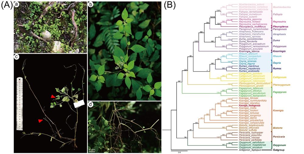 图 2. 墨脱冰岛蓼 (A)生境和植株图,红色箭头指向为珠芽位置。(B)基于叶绿体DNA片段(matK、rbcL和trnL-F)联合数据集构建的系统发育树。