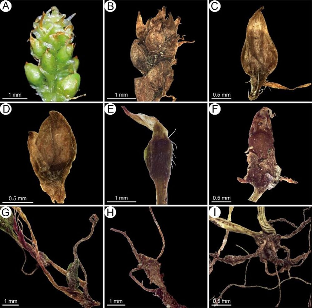 图 3 . 墨脱冰岛蓼的珠芽结构 A-D花序顶端的珠芽;E-I匍匐茎顶端珠芽的生根过程(不同发育阶段)。