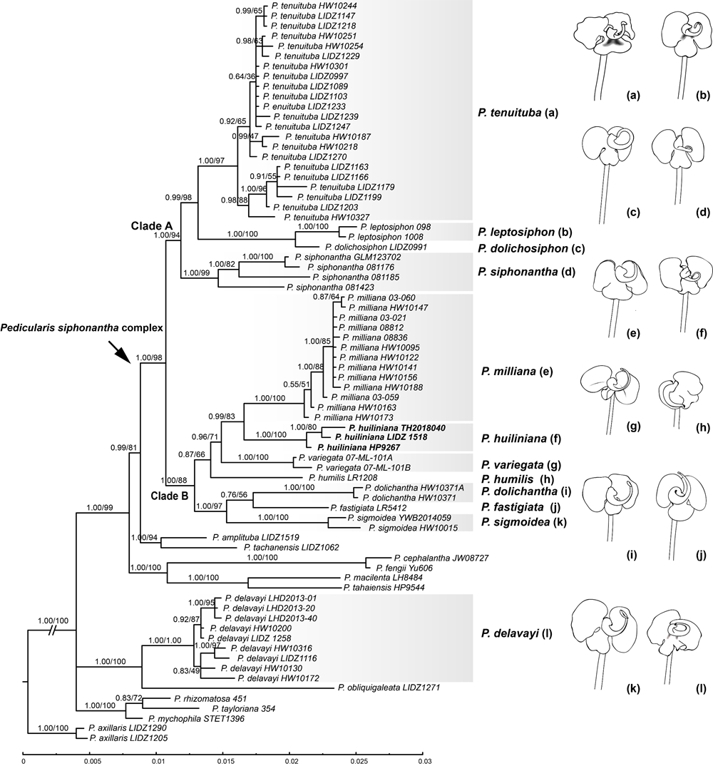 在轿子雪山发现的新种同样形成稳定的单系分支。其与修花马先蒿的分布地直线距离不足40公里,但最近姐妹群却是滇西北马先蒿(图2)。该类群不仅地理分布独特、系统发育独立,在叶片、苞片、花萼筒及“S”形喙的形态上亦有稳定差异。