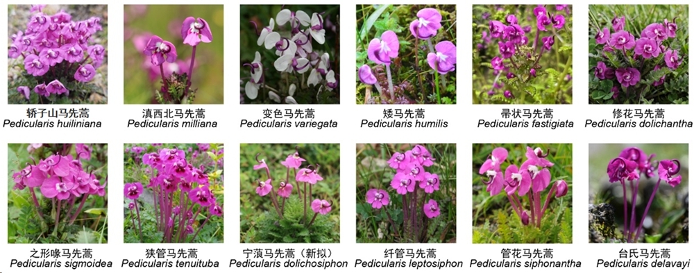 图1.管花马先蒿复合群成员以及形态趋同种台氏马先蒿(P. delavayi)野外照片。