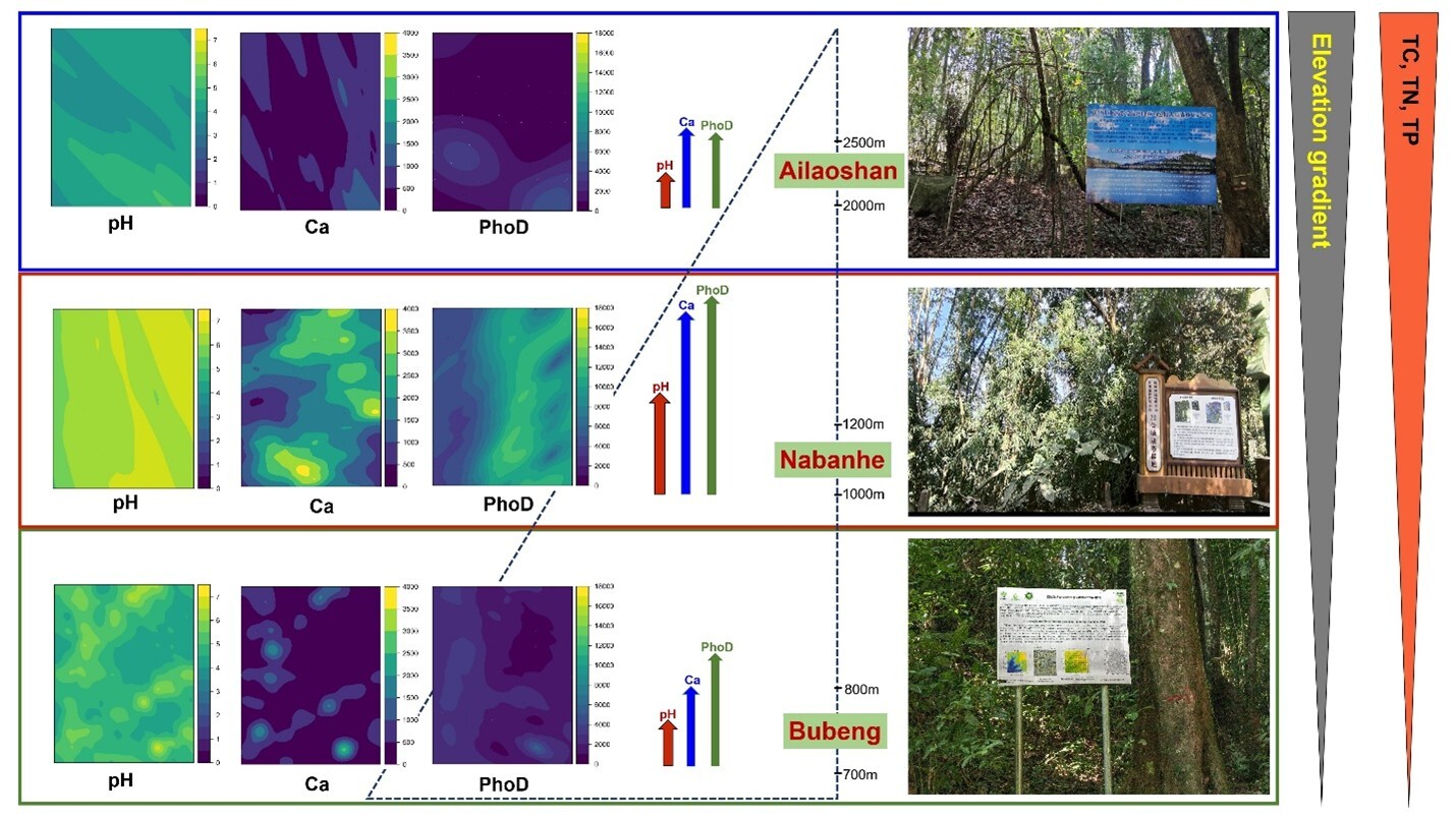 该研究选取海拔梯度较大、纬度范围较小的热带森林(纳板河和补蚌样点)和亚热带常绿阔叶林(哀牢山样点)20公顷样地开展土壤微生物PhoD基因多度的空间分布和相关环境因子调查,其目的在于:(a)探明PhoD基因多度的空间分布格局;(b)查明在局域和区域尺度上驱动其多度变化的关键因子;(c)解析土壤化学性质对其分布的影响。主要结果显示:不同森林中的 PhoD 基因多度和检出率呈现显著差异。中海拔的纳板河热带森林样地(1015.86–1235.64米)PhoD基因多度最高且分布最为广泛,低海拔的补蚌热带森林样地(712.05–860.05米)次之,而高海拔的哀牢山亚热带常绿阔叶林样地(2443.78–2586.13米)多度最低且常未达检出限,其中哀牢山森林的最高未检出率与其他样地呈现显著差异。进一步分析表明,在区域尺度上,海拔、土壤pH和钙含量是预测PhoD基因多度与分布的主导因子;土壤pH在区域与局域尺度均对PhoD基因多度表现明显的驱动作用。区域尺度上,海拔主要通过改变土壤pH及大量营养元素(全碳、全氮、全磷)间接影响PhoD基因多度空间分布,而在局域尺度上,PhoD 基因多度空间变异则与土壤母质的变化密切相关,其进一步调控土壤pH与钙的动态。