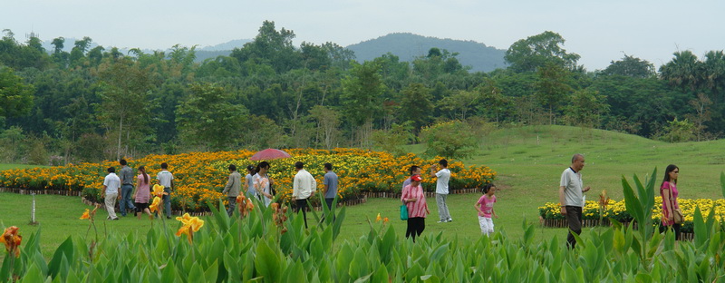 那么,请您来这里——在这里,您不仅可以感受纸扇花、黄蝉花、紫蝉花、扶桑花、龙船花、蝎尾蕉花等的艳丽,您还可以欣赏到以黄红色为基调色,配以白色、粉红、紫红、乳黄、紫红色组成七朵彩云图案的花海,让您在版纳园内尽享七彩云南热带花卉的魅力。