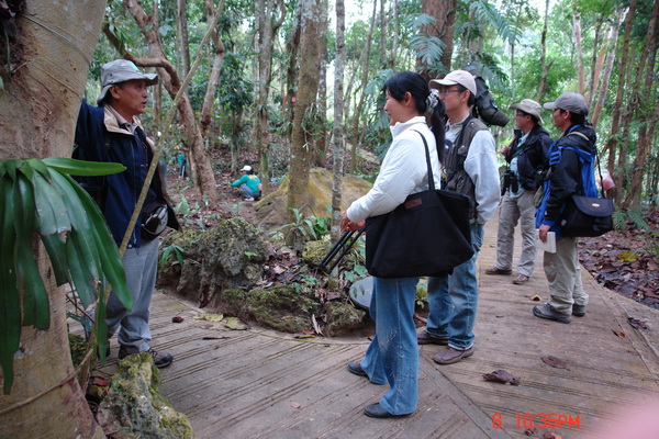 “你们在看什么?我们可以看看吗?”一位游客好奇的指着观鸟者的莱卡单筒望远镜问道。“看吧!没有关系的。”王西敏很热心的将望远镜让给游客看。“哇!好漂亮,是什么鸟?”,游客问道。“蓝喉拟啄木鸟,它喜欢隐蔽在高大的乔木当中,它——” 王西敏向围观过来的游客介绍了起来。他是队伍里较为资深的观鸟爱好者,总是随身带着一本《中国鸟类野外手册》,向新手们讲解所见鸟儿的名称、习性、特征。据他介绍,队伍中大部分观鸟队员在大多数情况下,能凭鸟儿的叫声或身影,就能判断出那是什么鸟儿。此次来我园观鸟的队伍中还有来自台北野鸟协会陈英彦、南投县野鸟学会的理事长蔡牧起也参与了此次活动。趁此机会,版纳植物园的科普教育工作者与他们进行了深入的交流,并达成了部分科普交流的合作意向。