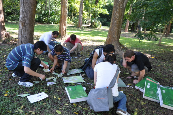 与一般定向比赛不同的是,来自TNC的工作人员被分为四个组,最快找完所有点的组便胜出。比赛开始后,只见队员们手持定向地图和指北针,顶着烈日,奔跑在植物的海洋中,不断地搜寻隐藏在植物背后的点标。而我们为各位队员准备的闯关任务也受到了大家的欢迎。在棕榈园中的“穿越A4纸”考验了大家集思广益的能力,而关于菩提树的提问也让大家对这一重要的佛教植物有了深入的了解,拼图游戏则让大家认识到了热带雨林中独具特色的动植物。经过半个小时的比赛,大家都顺利地完成了比赛,速度最快的队伍还得到了植物园专门制作的“走近热带雨林”宣传手册。大家也为我们提供许多活动改进意见,希望我们的活动越办越好。