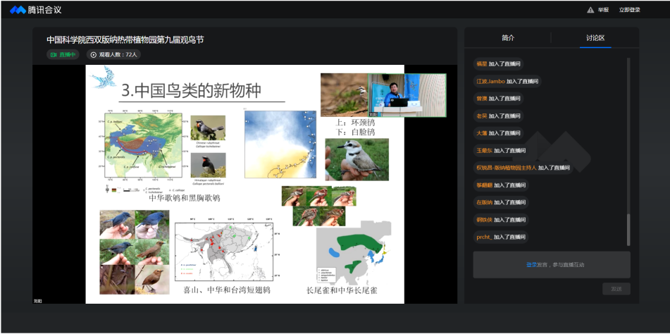 版纳植物园为褐喉食蜜鸟、长尾鹦雀、白眉黄臀鹎和斑姬地鸠四个中国鸟类新纪录的发现地,“鸟类新纪录”也成为本届观鸟节的主题。版纳植物园根据这个主题邀请了中山大学鸟类学教授、《中国鸟类观察手册》主编刘阳博士和盈江观鸟协会创始人、“2021年度中国野生生物影像年赛年度最佳自然摄影师”曾祥乐为观鸟节代表和自然爱好者分别带来了题为“近年来中国鸟类新纪录及分析”和“近年来云南鸟类新纪录及云南观鸟攻略”的科普讲座。除了观鸟节代表和版纳植物园自然爱好者外,另有来自勐仑中学和勐仑小学的同学自发前来参加科普讲座。应因为疫情不能参加观鸟节的自然爱好者的要求,主办方为科普讲座开通了线上直播,共有近200人次在线观看了本届观鸟节的两个科普讲座。