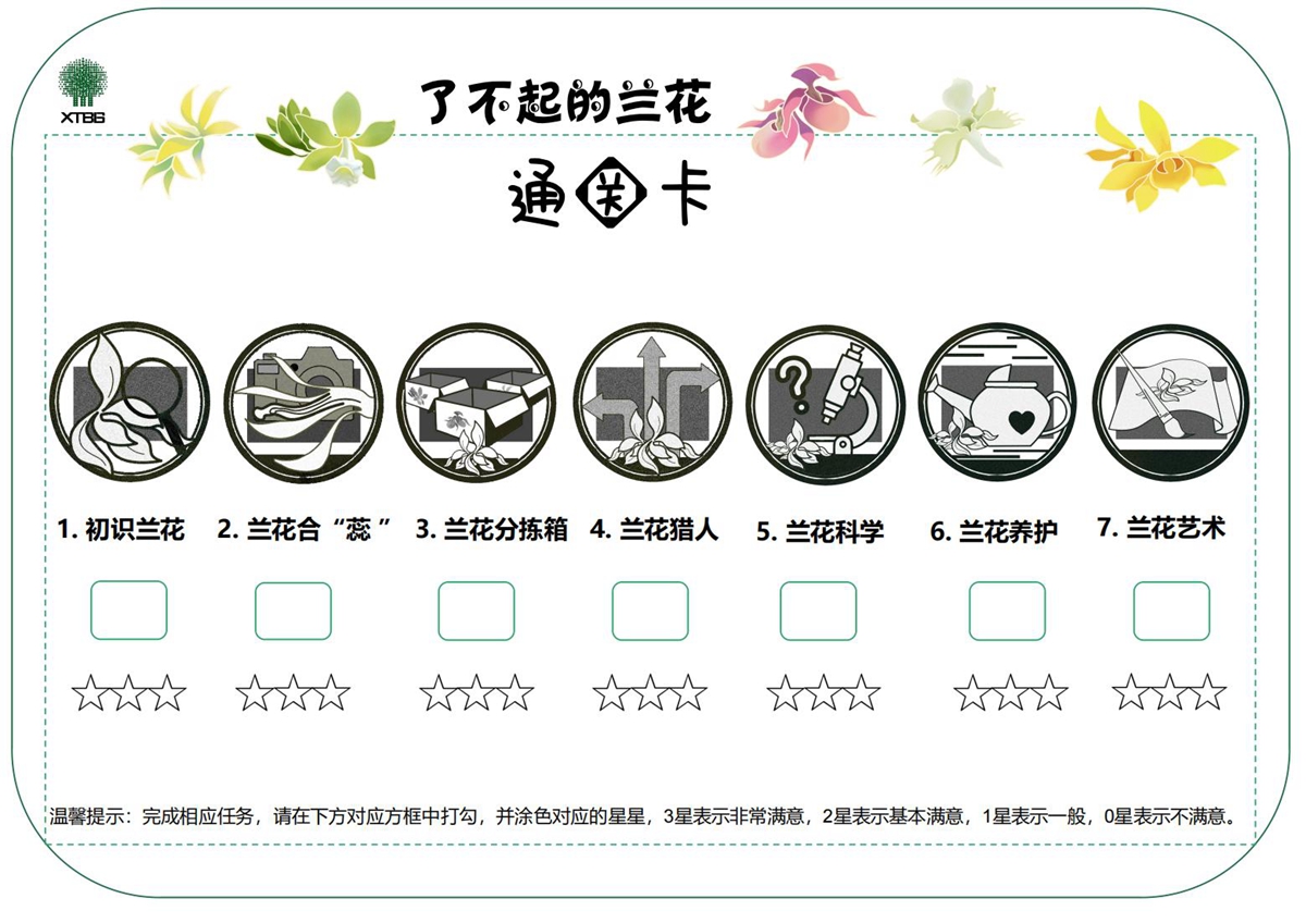 “了不起的兰花”由以下7项子任务组成:初识兰花、兰花合“蕊”、兰花分拣箱、兰花猎人、兰花科学、兰花养护和兰花艺术。活动期间,公众通过特制的通关卡对各子任务进行逐一体验和评价。其中,(1)在“初识兰花”环节,通过解读兰花的花程式,结合图解、拆花、互动游戏等,公众可初步了解兰花的奇葩花结构;(2)在“兰花合‘蕊’”环节,通过与兰花照片墙合影,深入了解兰花的合蕊柱结构、与兰花产生进一步的联结;(3)在“兰花分拣箱”环节,通过特制的兰花分拣箱,对兰科植物5个亚科的成员进行分门别类,助力了解兰花家族成员概况和基本分类;(4)在“兰花猎人”环节,通过DIY制作三角龙(白垩纪植食性恐龙)胸章,扮演三角龙,寻找兰展中与任务单匹配的兰花,进而了解兰花最早与恐龙同龄,体验兰展中兰花多样之美;(5)在“兰花科学”环节,通过漫画图解、现场解剖、显微观察等,结合科学研究的最新证据,帮助公众理解为何兰花能在第五次生物大灭绝中幸存、并多样进化;(6)在“兰花养护”环节,通过科普手册和展板,了解野生兰花的濒危现状,学习种植养护兰花,提升公众的保护意识;(7)在“兰花艺术”环节,通过涂色、拼贴、胸章DIY等形式,开展兰花生物多样性主题的艺术创作,体验生物多样性的和谐之美。