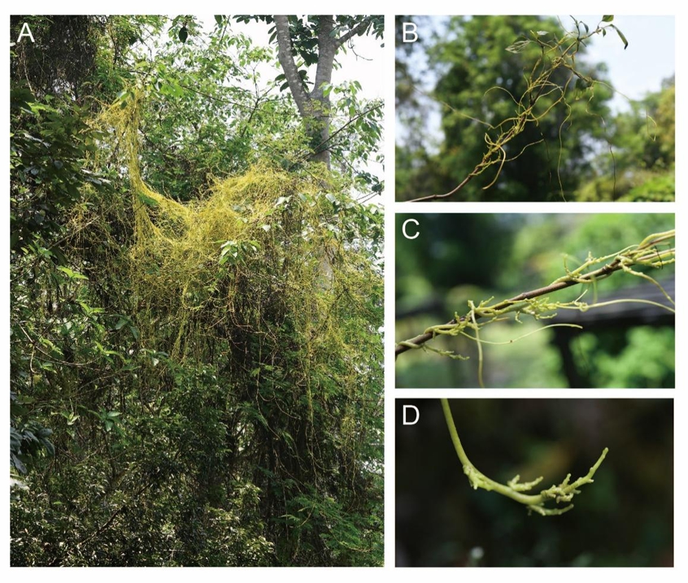 图1 菟丝子属的生境及形态特征(图为大花菟丝子Cuscuta reflexa Roxb.)