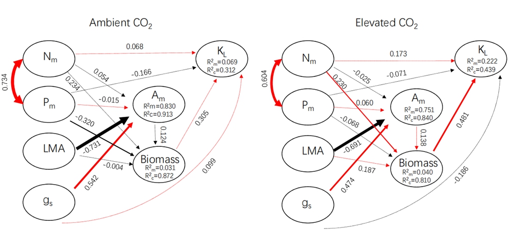 图2 对照CO2和升高CO2浓度处理下叶片性状、生物量以及枝条水力导度之间的结构方程分析。红色的线和黑色的线分布表示正和负的回归关系;实线和虚线分别表示显著和不显著的回归关系。