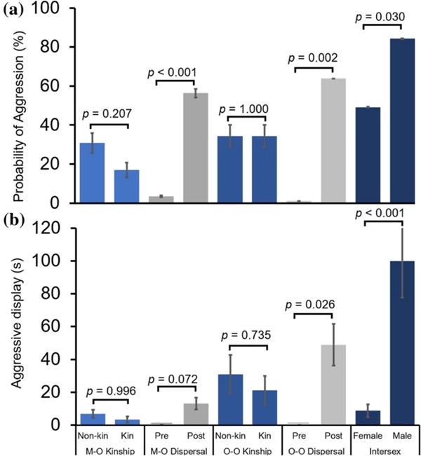 图1:亲属(Kin)与非亲属(Non-kini)、群居个体(Pre-dispersal)与独居个体(Post-dispersal)之间攻击行为的对比
