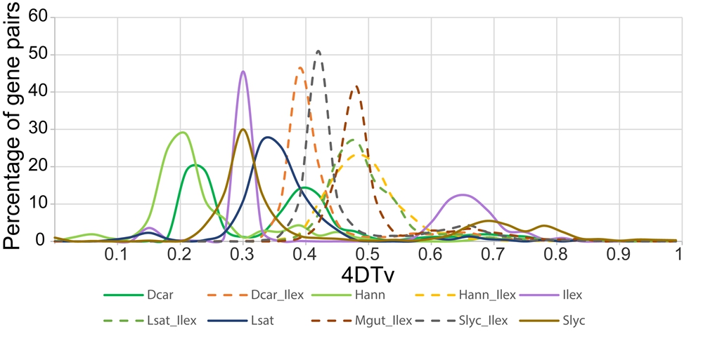 图2. 基于多脉冬青和菊分支(asterids)5个物种的全基因组加倍事件分析。图中Ilex表示多脉冬青(Ilex polyneura),Lsat表示莴苣(Lactuca sativa),Dcar表示胡萝卜(Daucus carota),Hann表示向日葵(Helianthus annuus),Mgut表示沟酸浆属植物(Mimulus guttatus),Slyc表示番茄(Solanum lycopersicum)。