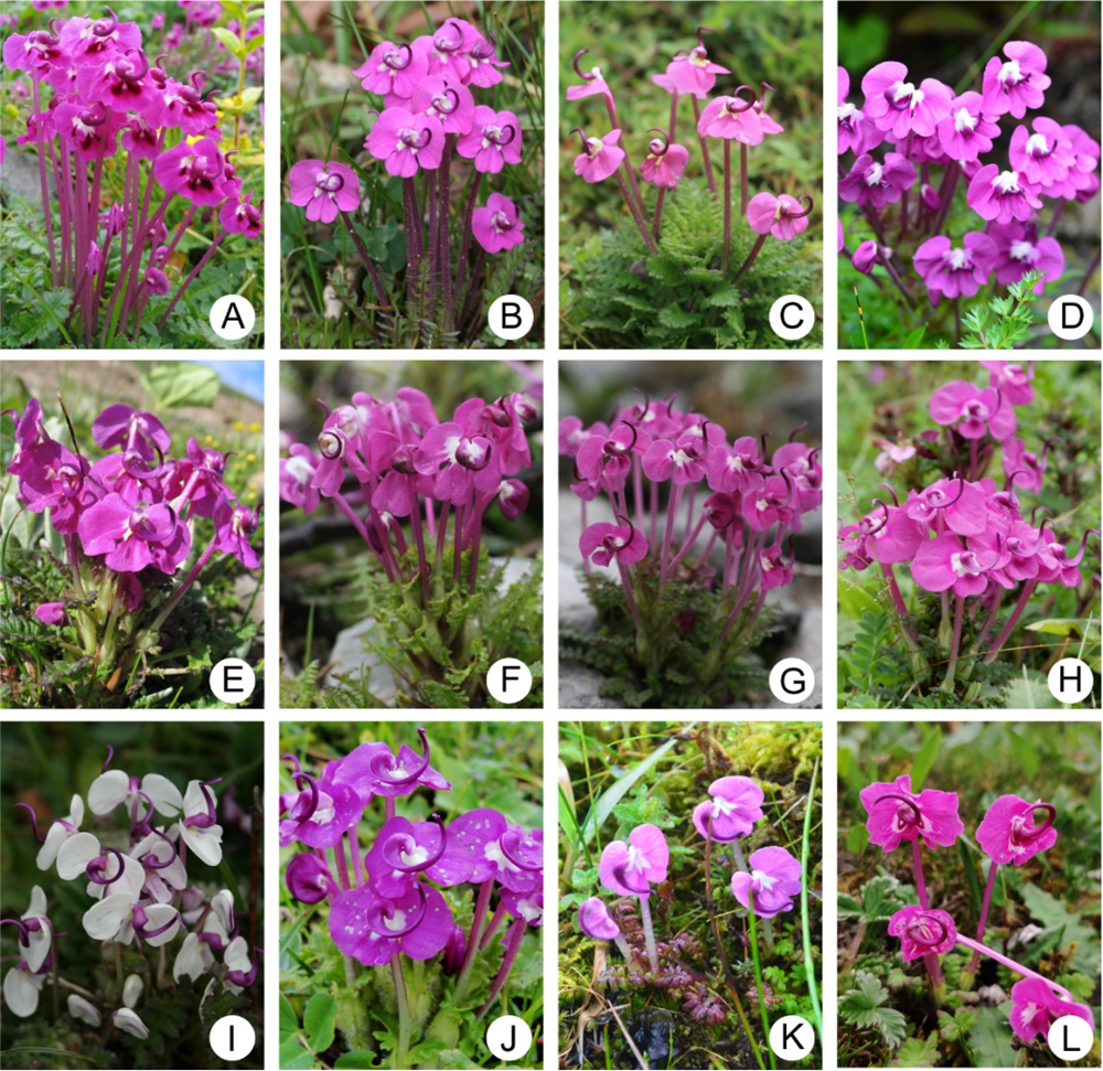 A. 狭管马先蒿; B. 纤管马先蒿; C. 宁蒗马先蒿(新拟); D, 管花马先蒿; E. 未知种2 (轿子雪山); F. 滇西北马先蒿; G. 未知种1 (玉龙雪山); H. 之型喙马先蒿; I. 变色马先蒿; J. 修花马先蒿; K. 矮马先蒿; L. 台氏马先蒿.