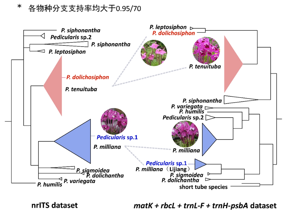 图2. 核糖体ITS数据集(左)和质体基因联合数据集(右)构建的管花马先蒿复合群系统发育关系框架