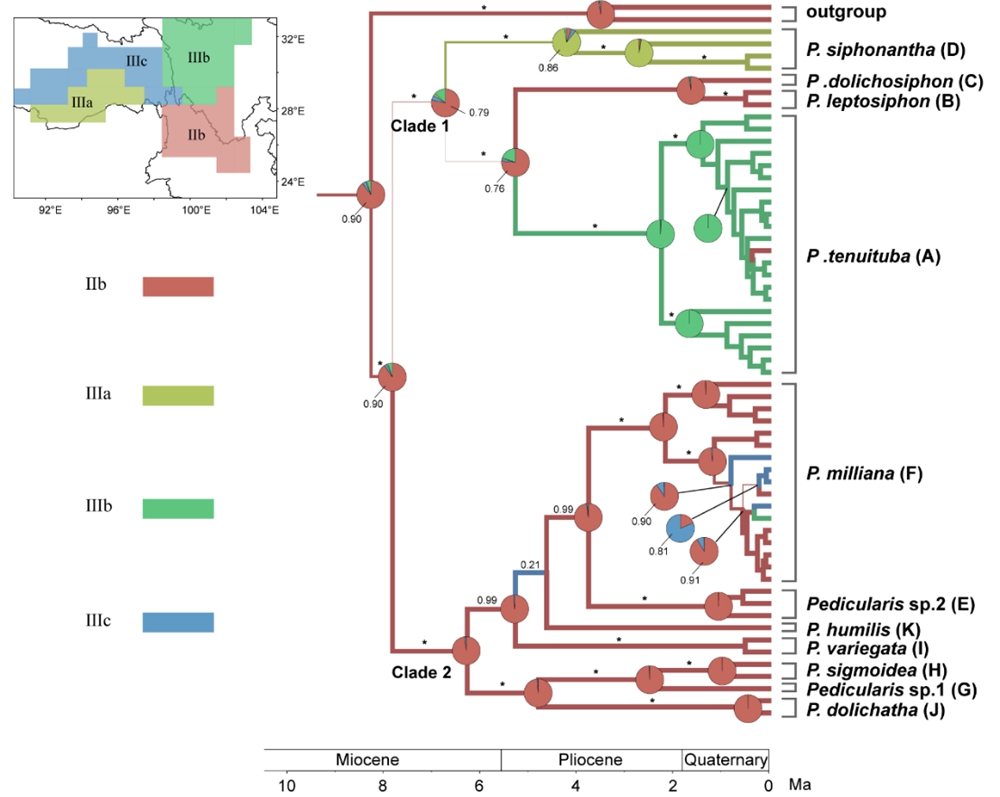 基于超级矩阵数据集估算管花马先蒿复合群的祖先分化时间的结果表明(图3),该物种复合群的祖先起源于中新世晚期约8.79Ma (95%HPD, 6.04Ma–10.38Ma),进化分支Clade 1和Clade 2,以及内部物种的形成和演化主要集中在中新世晚期至上新世之间 (2.28Ma–6.89Ma),这可能与这时期横断山的地区山体运动和抬升关系密切。进一步的祖先分布区重建表明管花马先蒿复合群祖先存在于横断山南部(IIb),随后向横断山北部以及喜马拉雅地区(Ⅲc,Ⅲa)扩散,其中Clade 1中物种主要在横断山北部以及喜马拉雅地区形成和演化,Clade 2物种主要在横断山南部形成和演化。所有物种均具有相对独立的物种分布区,部分分布区重叠的物种则在海拔或生境上发生分化,极少能见到该复合群的物种同域/邻域分布,因此分布信息可作为物种鉴定的重要依据。