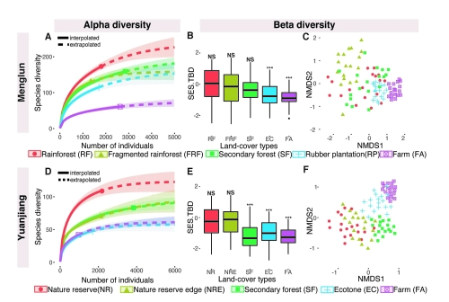 图1 勐仑与元江研究样点蝴蝶多样性。(A,D)α多样性:基于样本大小的稀疏和外推法(虚线段)物种丰富度(q = 0)的抽样曲线;(B,E)不同土地利用类型下的β多样性(SES-TBD); (C,F)基于五种土地利用类型下的非度量多维尺度(NMDS)图。