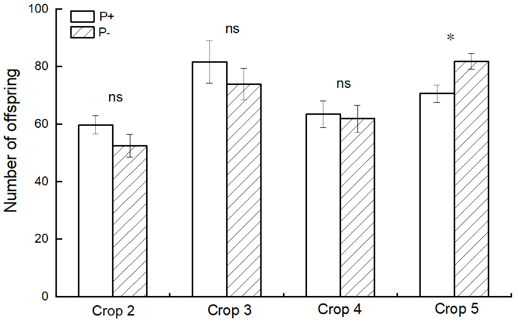图3 传粉榕小蜂带粉及未带粉繁殖的后代数量,三个重复实验中带粉(P+)与未带粉(P-)传粉榕小蜂繁殖的后代数量没有差异,一个重复实验中未带粉雌蜂比带粉雌蜂繁殖显著多的后代,结果显示榕树(F. microcarpa)没有对未传粉榕小蜂实施寄主惩罚。