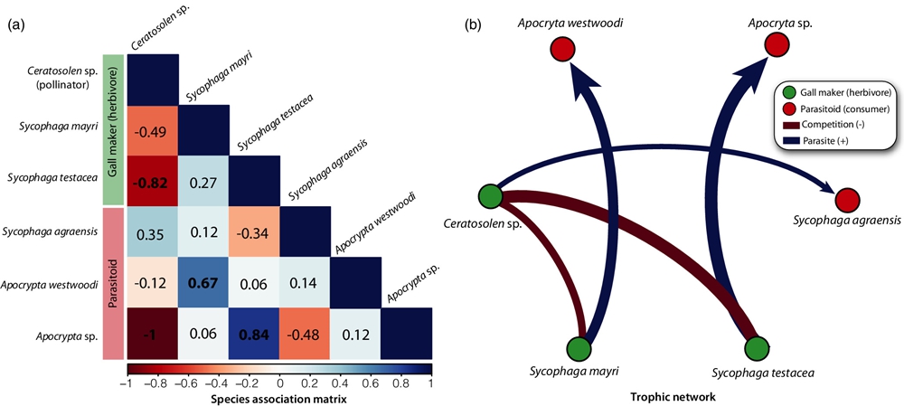 榕树依赖专一的榕小蜂传粉,也被多种非传粉小蜂寄生,形成互惠、共生系统,是研究群落水平上气候变化对物种及种间互作影响的理想材料。该研究以雌雄同株聚果榕的榕小蜂群落作为研究对象,系统收集了采集自于中国云南西双版纳勐仑镇和怒江州六库市、缅甸曼德勒、老挝琅南塔和泰国乌隆的榕小蜂群落数据,目标揭示气候如何影响多营养级生物互作体及其群落结构。首先通过应用层级联合物种分布模型(hierarchical joint species distribution models)分析了榕小蜂群落数据,检测了聚果榕多营养级榕小蜂群落多种种间互作的关系与强度。再进一步评估气候变化如何通过影响单个物种动态及种间互作的级联效应传递给整个群落结构。研究发现:当处于非最佳气候条件时,同一营养级之间的种间竞争更倾向于非优势的非传粉造瘿小蜂,对优势的传粉榕小蜂不利;而且同一营养级之间竞争平衡的倾斜,通过跨营养级的级联效应促进了非传粉造瘿小蜂专性复寄生蜂的发生,从而导致群落结构的改变。结果强调了气候通过级联效应影响种间的不同互作关系,最终影响多营养级的榕小蜂群落。