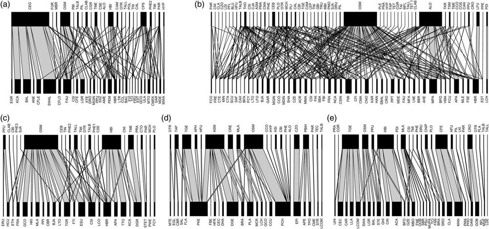 图1.西双版纳5个样地的蚂蚁-树二分网络。(a)纳板河(b)勐仑(c)补蚌(d)勐远(d)尚勇。每个网络上半部分的柱形图表示蚂蚁,下半部分为寄主树木。柱子宽度表示各物种的多度;连线宽度表示互作频率。物种编码见文章附件。在西双版纳,黄猄蚁(OSM, Oecophylla smaragdina)是主要的蚂蚁,与其互作的树种也是最多的。