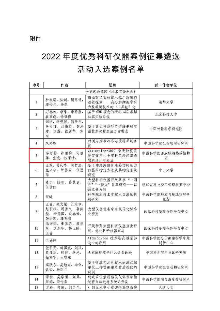 2023年3月,公共技术中心2022年投稿的仪器案例研究《Mastersizer3000激光粒度仪测定哀牢山土壤样品颗粒组成实验设计与验证》在科研仪器案例库优秀案例成果征集遴选活动中被评为一类优秀案例。