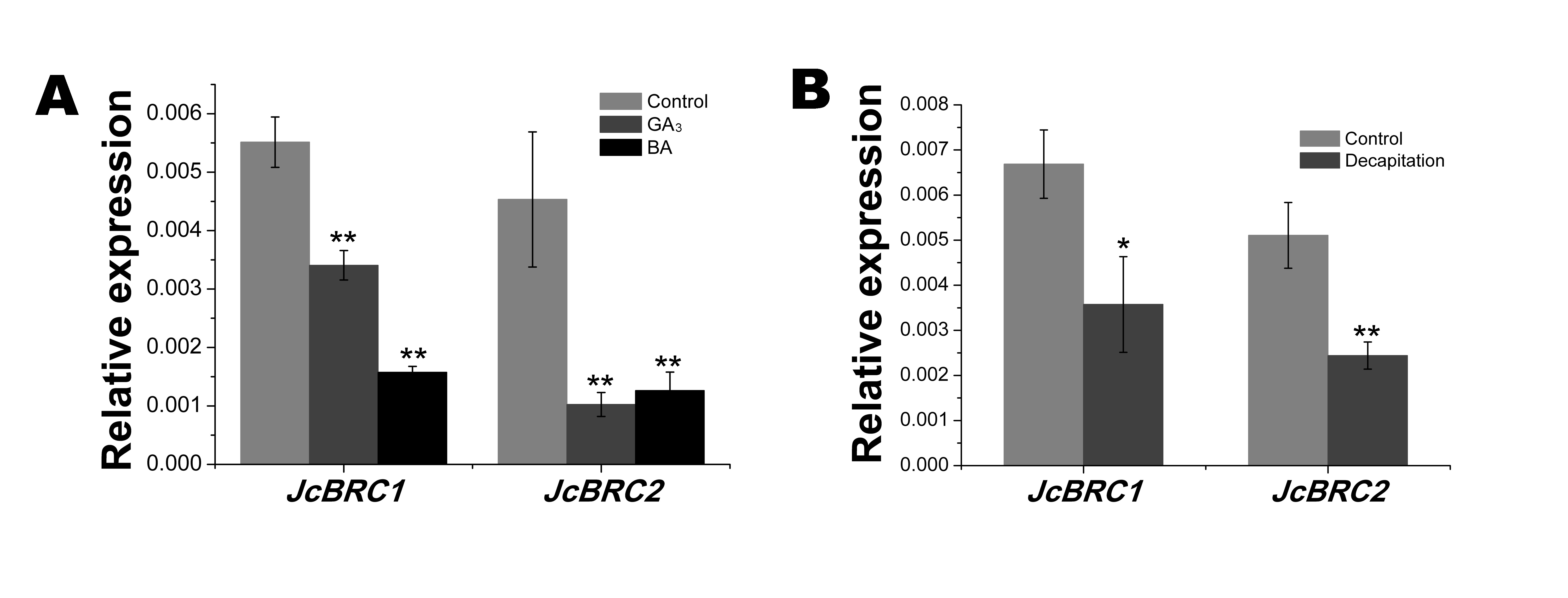 赤霉素(GA)和细胞分裂素(BA)和去顶端对小桐子幼苗分枝相关基因表达的影响(自倪军)