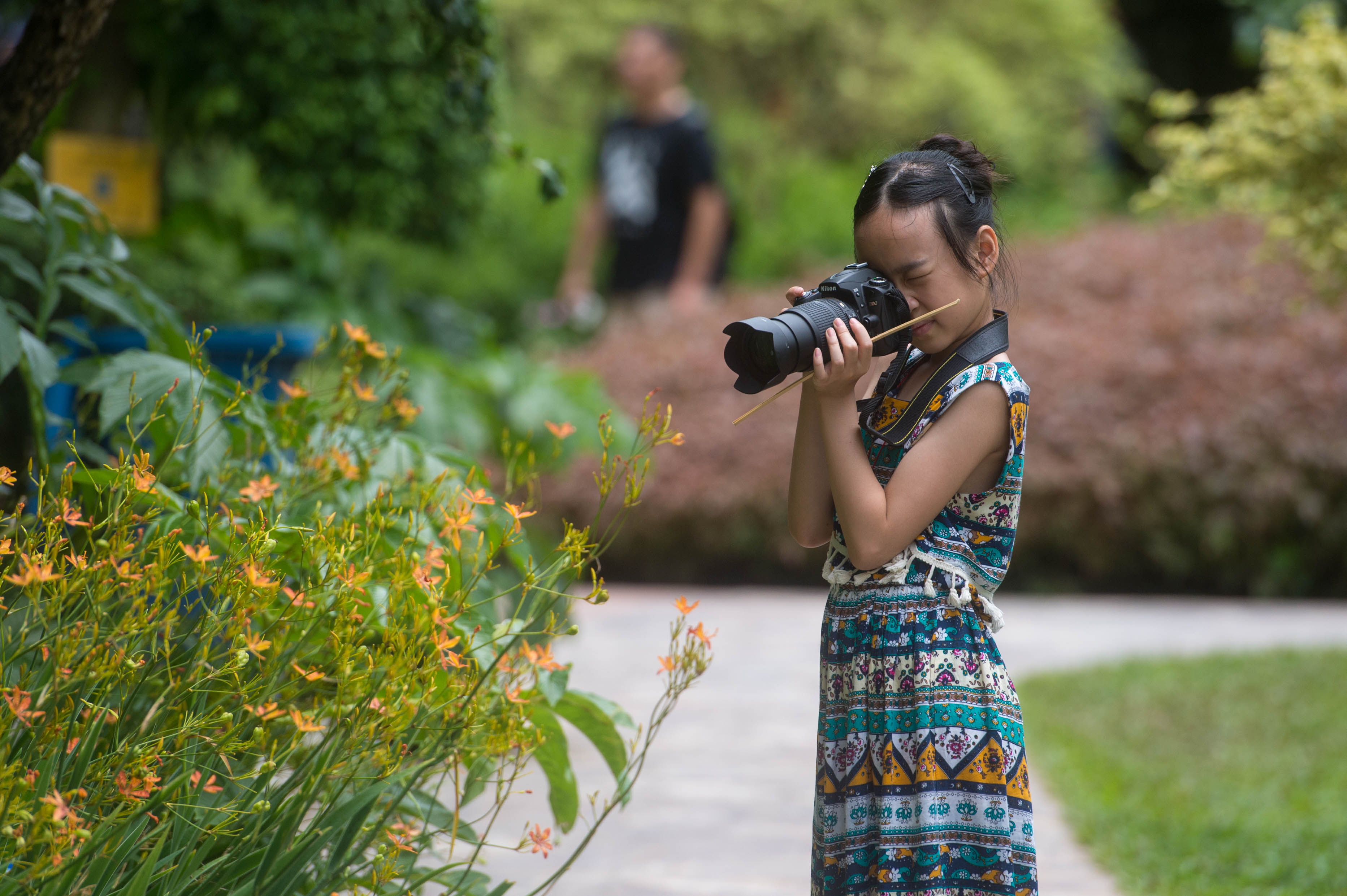 8月15日,在中国科学院西双版纳热带植物园的奇花异卉园中,小朋友在拍摄园内植物。