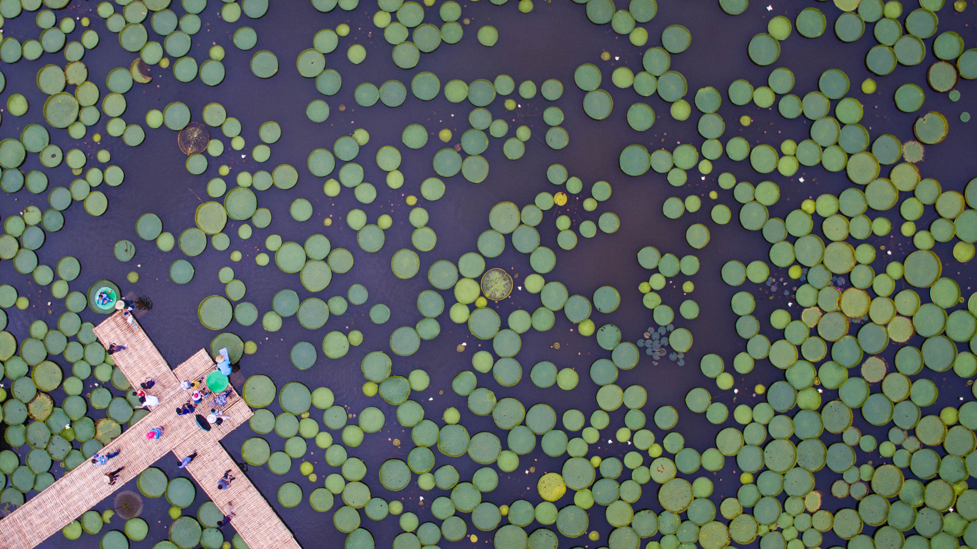 8月15日,游客在中国科学院西双版纳热带植物园的水生植物园中观赏王莲。