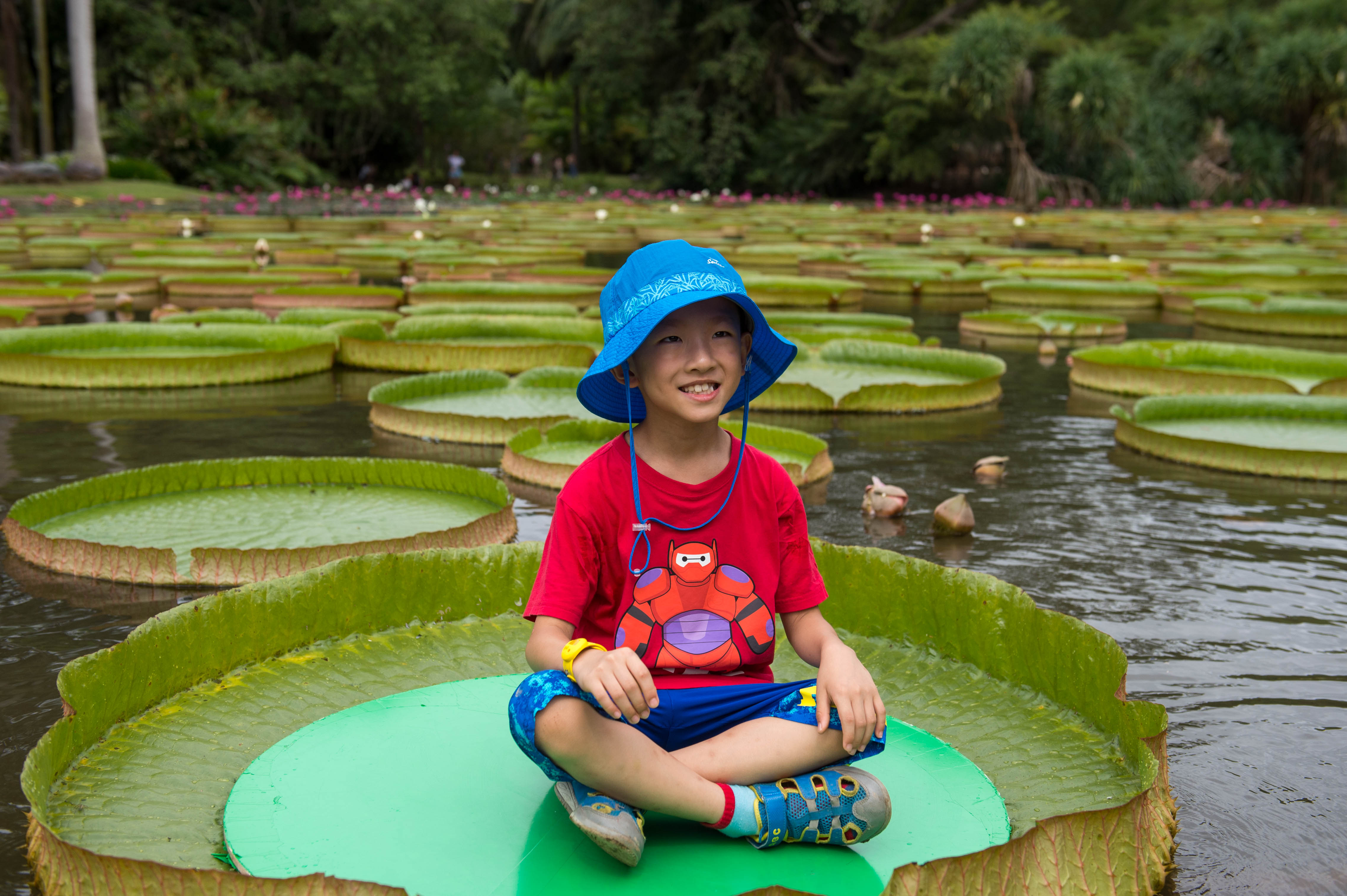 8月15日,在中国科学院西双版纳热带植物园的水生植物园中,小朋友在体验“乘王莲”活动。