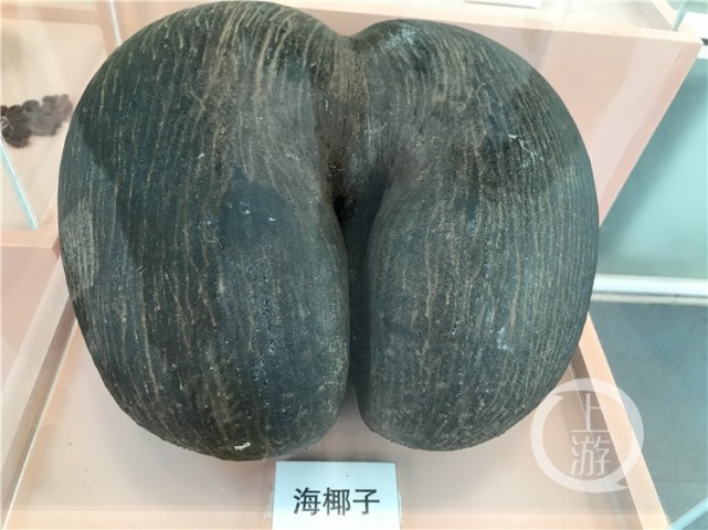记者在展览温室内看到,现场展出的海椰子大小相当于两个橄榄球,外壳和椰子壳相似。