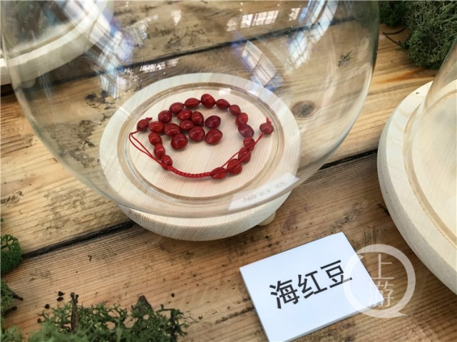 温室内展出的海红豆被串成了一串手链。海红豆鲜红色的种子光亮而又美丽,因此常被制作成了手链、项链等饰品。