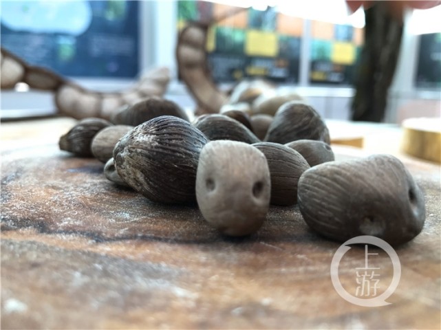 依尖防随手拿起一颗油棕种子,种子上有三个小点,看上去就像是眼睛和嘴巴,表情呆萌。她又随手拿起了一颗油棕种子,这颗种子有一对小“眼睛”,表情显得更加萌萌哒。