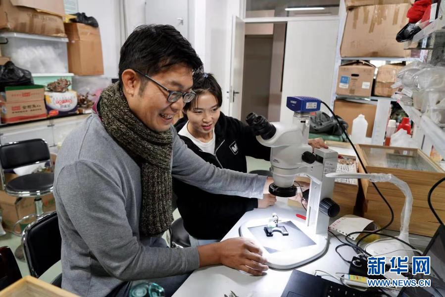 2月5日,中科院西双版纳热带植物园日本籍研究员中村彰宏指导学生观察昆虫。新华社记者 孟佳 摄