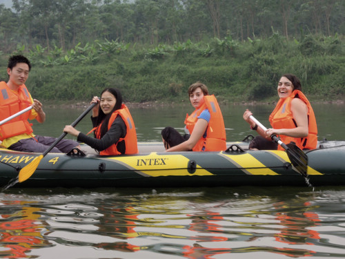 清晨的罗梭江面,晨雾氤氲,鹭鸶翱翔,关关雎鸠,景色迷人。青年朋友们激情四射,大家共同搬运、为橡皮艇充气、安装船桨,忙得不亦乐乎。不一会功夫,在大家共同努力下,橡皮艇、队员、护航人员全部就位。随着一声“出发”的口令,大家开始漂流行程。仿佛间,百舸争流,大家也要会当水击三千里。只可惜,小艇就是左摆右幌,原地打转,不听指挥。在队员们不断探索、不断协助、不断努力下,它终于被驯服了。大家也体验了“两岸鸟声啼不住,轻舟已过多重山”的感觉。朋友们都士气高涨,有的玩起了水仗、有的哼起了小曲、有的干脆躺在船里,舒适的享受起来……
