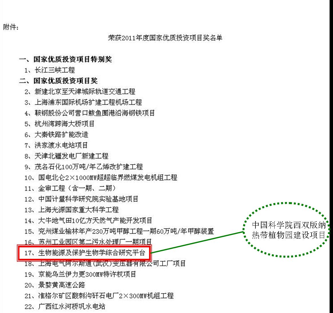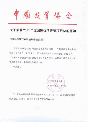 接到中投协字【2011】010号中国投资协会关于表彰2011年度国家优质投资项目的决定的文件,我园申报的“生物能源及保护生物学综合研究平台”建设项目被评为2011年度国家优质投资项目。该项目经中国科学院基建局和国家发改委评审中心推荐,通过了5月3日国家优质投资项目专家审查委员会的评价,亦报5月13日审定委员会表决审定。根据中投协字【2011】010号文件,中国长江三峡集团公司申报的“长江三峡工程”荣获2011年度国家优质投资项目特别奖;新建北京至天津城际轨道交通工程等37个项目荣获2011年度国家优质投资项目奖。