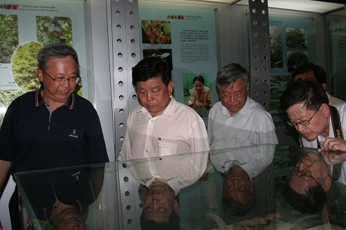 于永湛一行先后视察了百花园、奇花异卉园、热带雨林民族博物馆等景点。粉纸扇、龙船花、蝎尾蕉等色彩艳丽、造型奇特的热带花卉令大家目不暇接,而版纳园导游更以科学内涵丰富、环保意蕴深厚的讲解词赢得了客人们的赞誉。