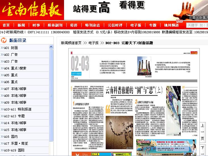 7月26日出版的《云南信息报》“云游天下”版的封面话题,刊登了《云南科普旅游的“思”与“困”》一文,重点以我园的科普旅游为范例,探讨了云南省科普旅游的机遇和挑战。