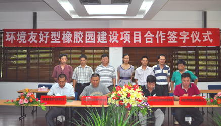 为保障环境友好型橡胶园建设各项工作的顺利实施,有效地推动建设工作,7月25日,版纳植物园分别与勐腊田野橡胶销售有限责任公司、云南景泰绿色产业有限公司签署了《关于建立环境友好型橡胶园试验示范基地的合作协议》。版纳植物园园主任陈进研究员与两家公司负责人在协议上签字。西双版纳州发展生物产业办公室主任李庆友作为见证单位代表参加了会议并在协议上署名。