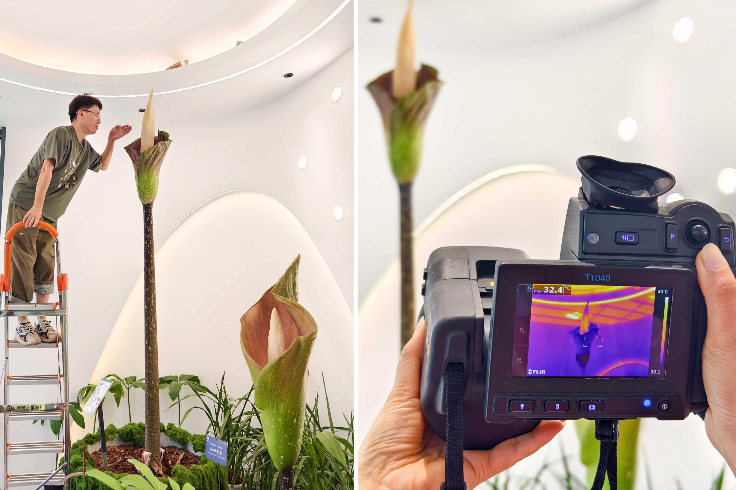 工作人员对高魔芋开花过程进行直播(左)与测温(右)