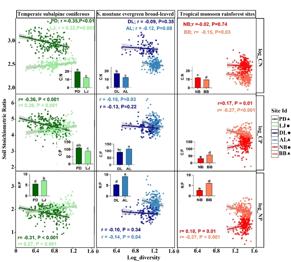 在全球气候变暖与森林生态系统功能维持的双重挑战下,理解植物多样性如何通过影响土壤养分平衡来提升森林适应力,已成为生态学与林业管理的核心议题。以往研究多聚焦于气候、地形等环境因子对土壤碳(C)、氮(N)和磷(P)化学计量的整体影响,而对于植物多样性,尤其是自然森林森林生态系统中,如何在不同环境背景下调节土壤养分限制,仍缺乏大尺度的实证证据。