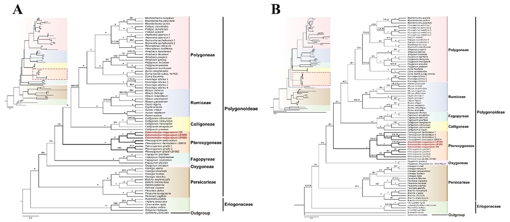图 1. 基于七个叶绿体片段联合数据集(A)和ITS序列(B)构建的蓼亚科系统发育关系。红色粗体字显示宽翼蓼的系统位置,嵌合于翼蓼属内。
