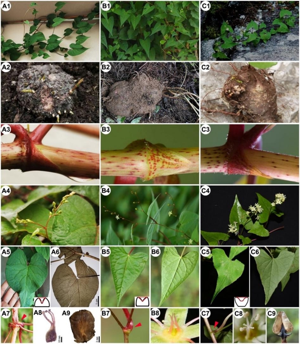 图 2. 翼蓼属三个物种的形态特征比较。A.宽翼蓼;B.齿叶蓼;C.翼蓼。