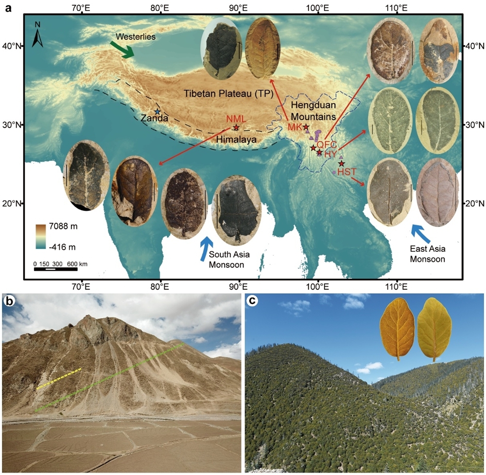 图1 栎属高山栎组植物化石材料和现生样品的采样点。MK:西藏芒康;NML:西藏南木林;HST:云南浑水塘;QFC:云南庆福村;HY:云南鹤庆红园。