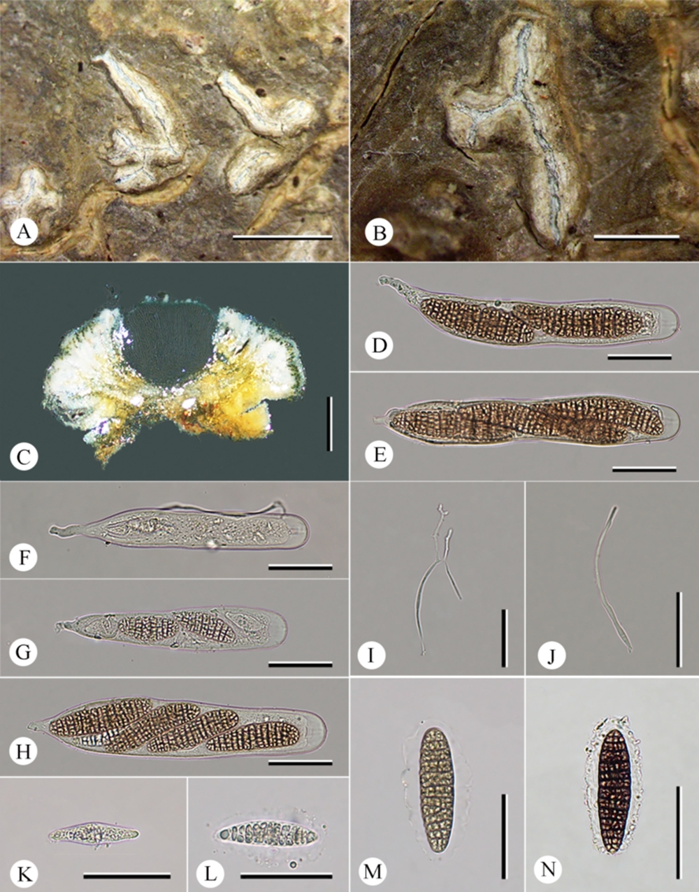 图 降斑点酸灰线衣 Pallidogramme norstictica (LCUF YN201045)。A, B. 具有裂生至凸起线盘的地衣体。C. 子囊盘切片。D–H. 子囊。I–J. 侧丝。K–M. 水中的子囊孢子。N. 卢戈氏碘液中的子囊孢子。比例尺:A = 2 mm,B = 1 mm,C = 200 μm,D–N = 50 μm。